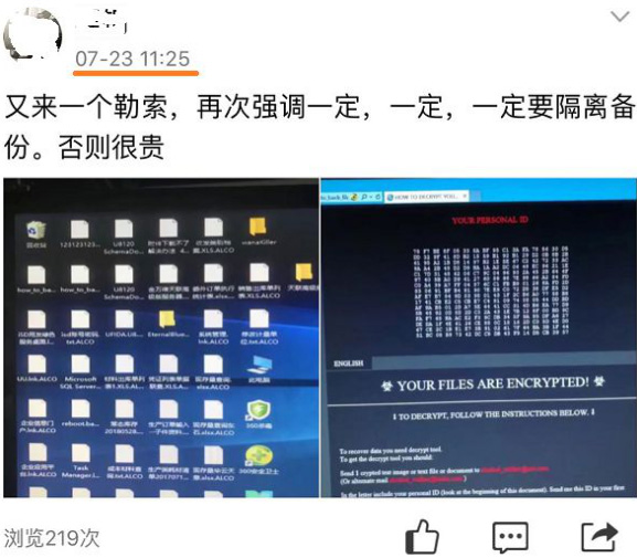 一年前肆掠的勒索病毒再次死灰復燃,新的變種開始在全國范圍蔓延,我們U8的個別客戶也未能幸免。