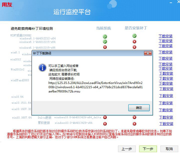 系統會彈出提示,告知下載耗時以及可以手工到對應地址下載安裝,點擊“確定”系統開始下載及安裝相關補丁。
